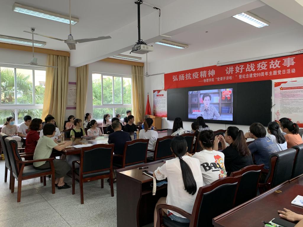 为进一步学习贯彻习近平总书记关于“让党旗在防控疫情斗争第一线高高飘扬”的重要指示精神,提升学生党员的爱国情感,深入宣传疫情防控的感人事迹和生动经验。7月1日,物理学院组织50余名师生党员在党员之家集中观看《高校党组织战“疫”示范微党课“七一”专场》。