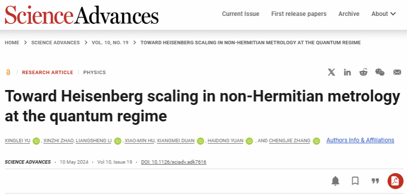 近日,麻豆av 张成杰教授课题组在非厄米量子精密测量研究方面取得重要进展,提出了适用于非厄米系统的量子Fisher信息和最优测量条件,并实验研究了非厄米量子参数估计问题,估计精度达到海森堡标度。相关研究工作以“Toward Heisenberg scaling in non-Hermitian metrology at the quantum regime (迈向量子领域非厄米计量学中的海森堡标度)”为题,于2024年5月10日在国际著名期刊《Science Advances》(科学进展)上发表。