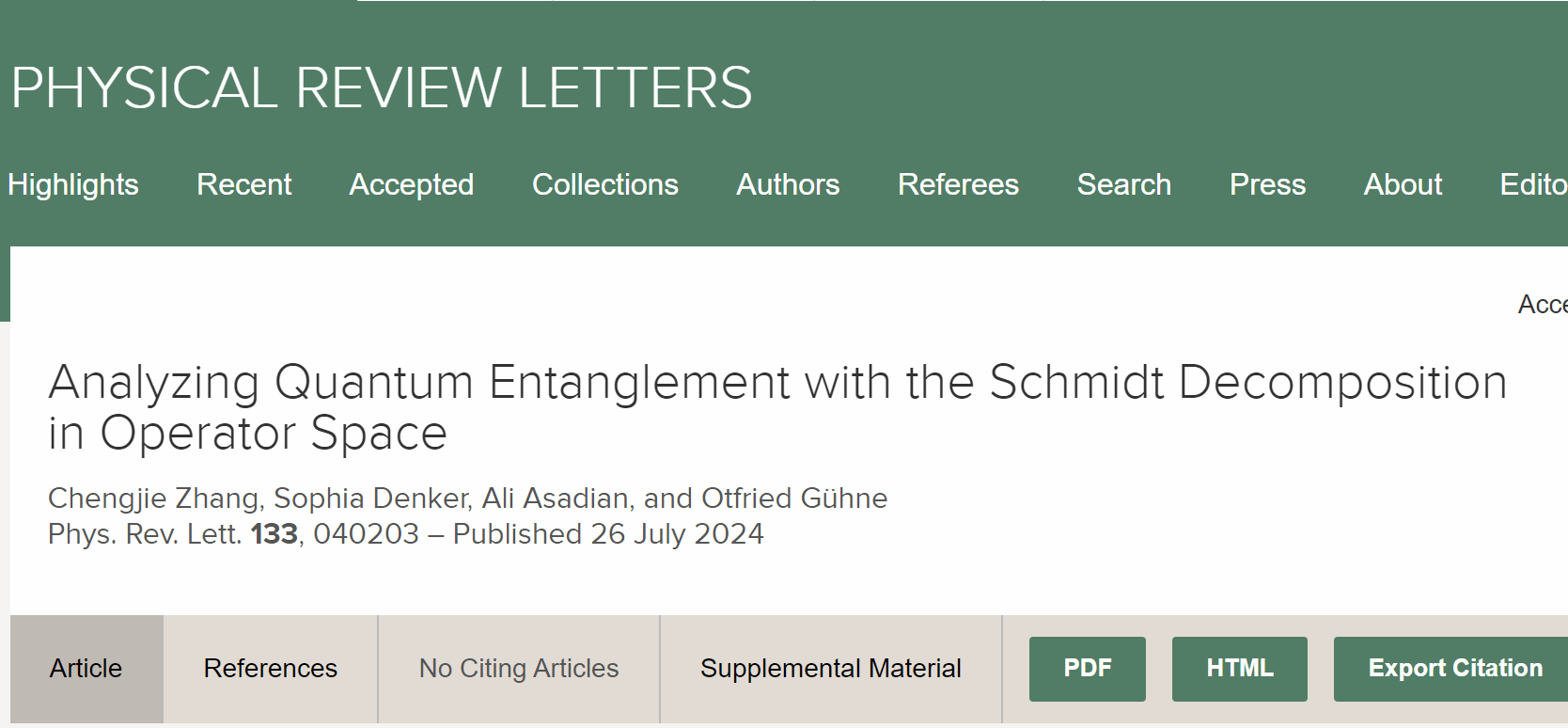 近日,麻豆av 张成杰教授课题组与德国锡根大学Otfried Gühne教授率领的研究团队携手,在量子纠缠这一前沿领域取得了突破性进展。他们创新性地提出了基于算符空间施密特分解的真多体量子纠缠目击者方法,这一成果不仅超越了传统基于保真度的检测方法,更通过详尽的量子态分析实证了其显著提升量子纠缠检测效能的能力。此项开创性研究,以“Analyzing Quantum Entanglement with the Schmidt Decomposition in Operator Space”(用算符空间中施密特分解分析量子纠缠)为题,荣耀刊登于国际顶尖学术期刊《Physical Review Letters》上,于2024年7月26日正式发布,标志着量子纠缠研究迈向了新的里程碑。