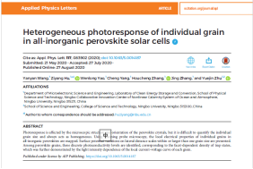 近日,麻豆av 胡子阳、诸跃进课题组在自然指数期刊《Appl. Phys. Lett.》发表题为“Heterogeneous photoresponse of individual grain in all-inorganic perovskite solar cells”(Appl. Phys. Lett. 117, 083902 (2020)的研究论文,并被作为精选论文(Featured Article)在期刊网站进行特别报道。宁大二年级硕士生王琰琰为该论文的第一作者,麻豆av 为唯一署名单位。
