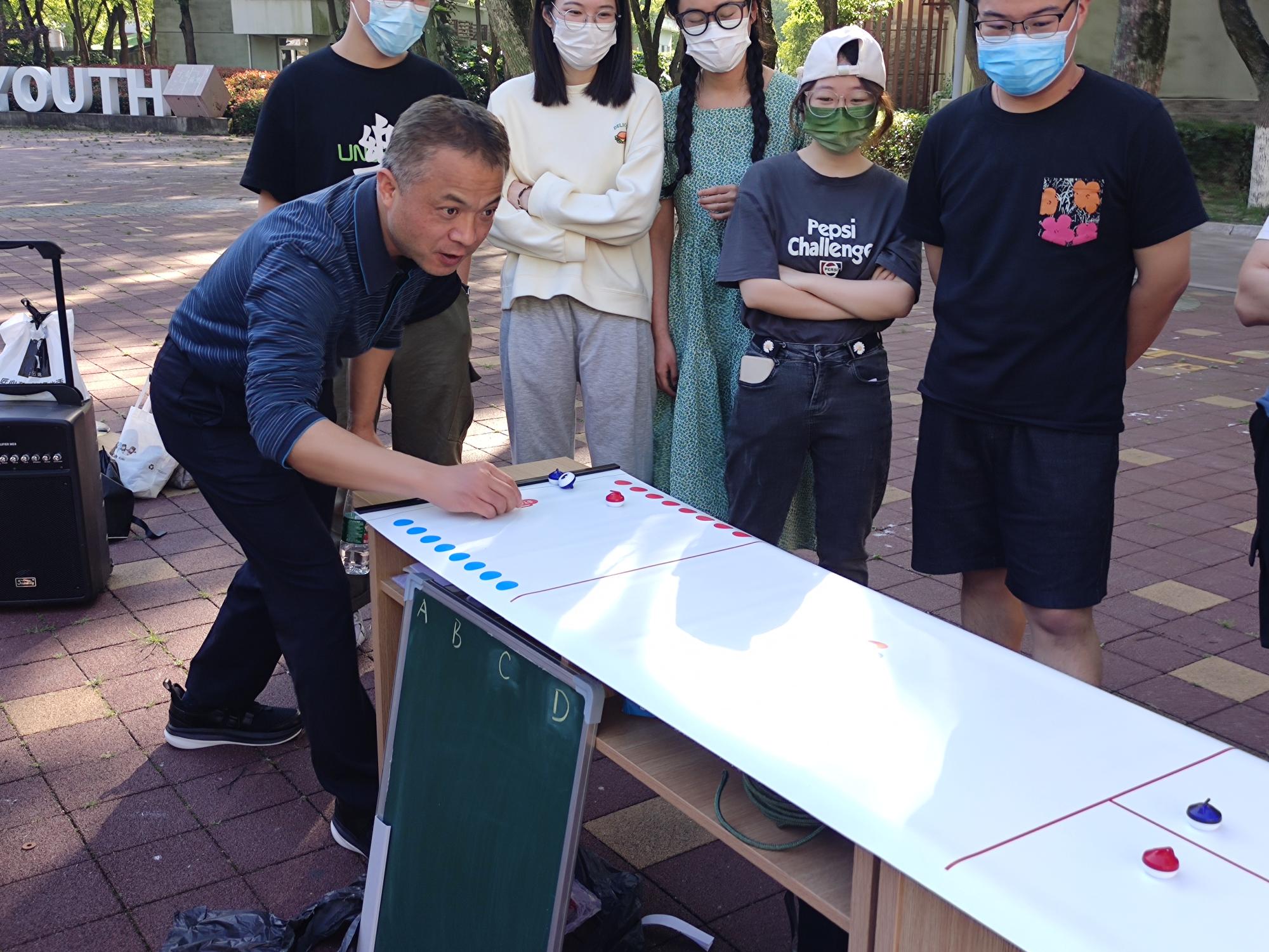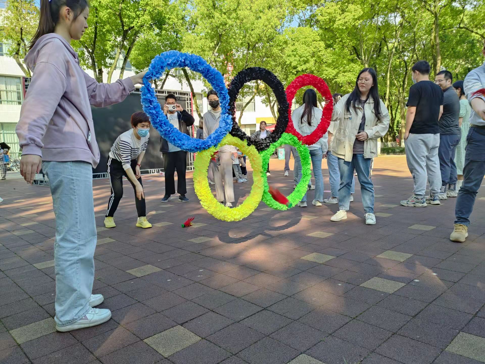本次师生运动会包含了桌上冰壶球、五环毽子、接力呼啦圈以及拔河四个比赛项目,师生随机分为四组,并在相互的讨论下确定自己的队名和口号,响亮的口号为队伍增添十足的士气。随后,桌上冰壶球、五环毽子、接力呼啦圈三项比赛一起进行,欢呼声、呐喊声充斥了整个有思广场。拔河比赛,两两对抗,“一二一二”的加油声鼓舞着运动员们奋力拉锯。最后四支队伍打成平手,运动会在一片欢笑声中结束。
