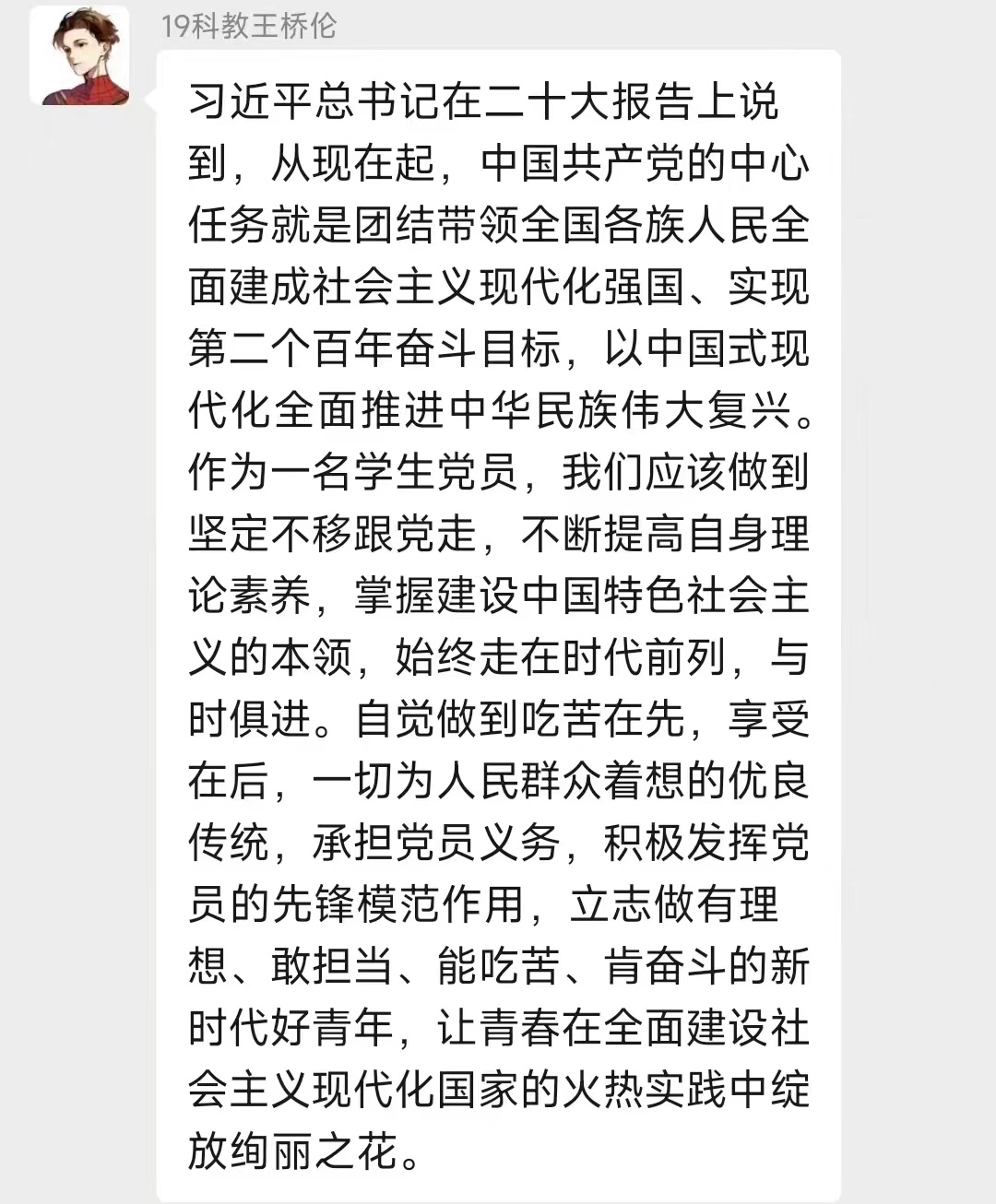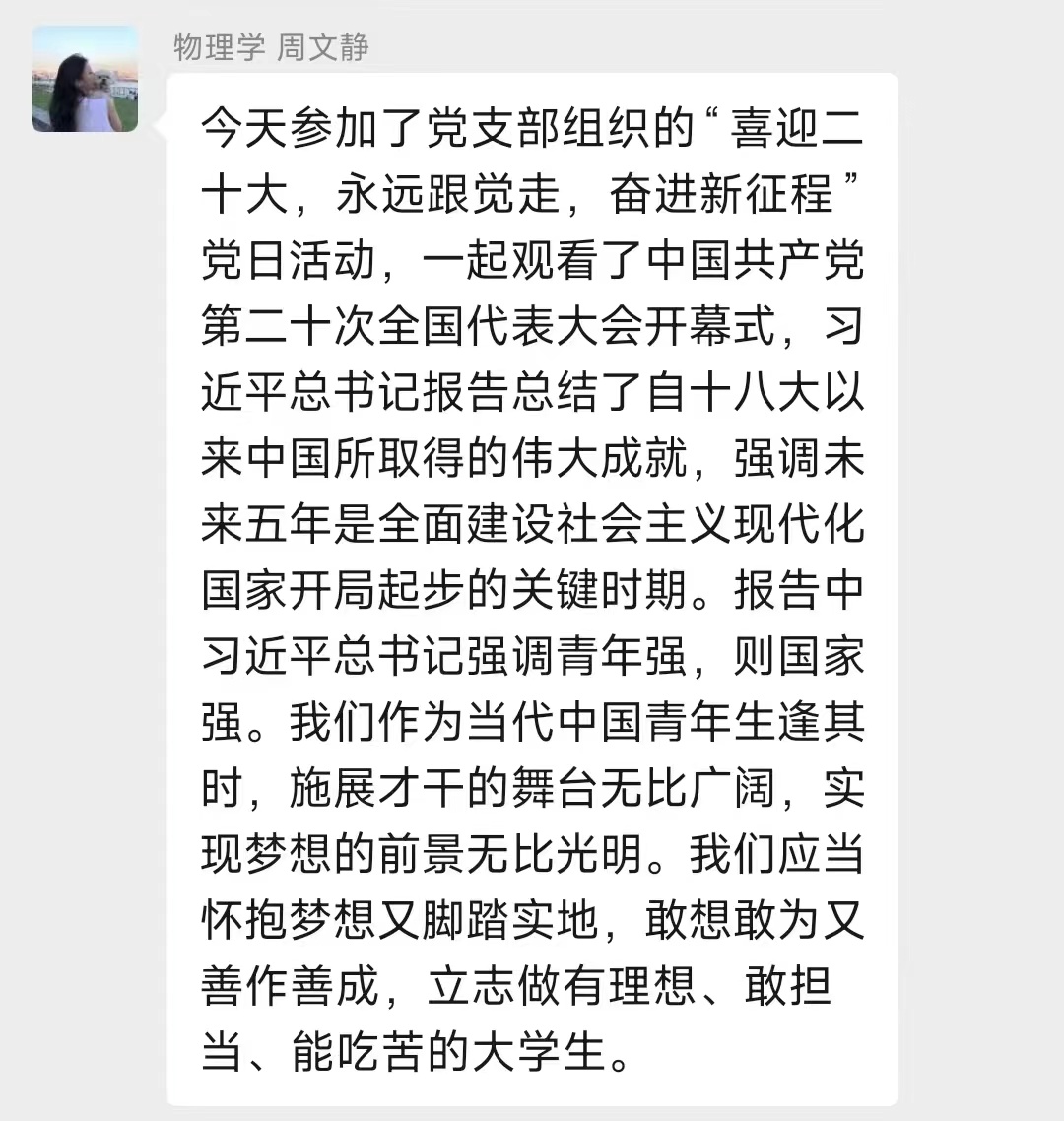 “我将认真学习二十大精神并牢记于心,紧跟党的步伐,听党指挥,为党和人民奋斗。脚踏实地,埋头苦干,奋勇前进,认真且努力塑造一个全新的自己,努力成为党和国家真正所需的真诚儿女。”“我要心存使命感与担当,跟随时代的步伐去努力实现中华民族伟大复兴的光荣使命!”“作为学生党员,我们应该做到坚定不移跟党走,不断提高自身理论素养,掌握建设中国特色社会主义的本领,始终走在时代前列,与时俱进。”与会的党员同志们纷纷在新媒体平台留下自己的所思所想。