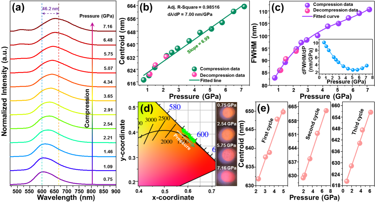 近年来,稀土/过渡金属掺杂发光材料由于其独特的光学特性而被广泛应用于白光LED、光学温度传感、光催化、压力检测等领域。其中,荧光检测因其具有分辨率高、非接触、相应速度快等优势,而被大量研究。近年来,荧光压力传感因其具有非接触、响应速度快、高分辨等优势而被广泛研究,其中红宝石(Al2O3:Cr3+)作为商业化产品而备受青睐。然而,红宝石具有灵敏度低(dλ/dP = 0.365 nm/GPa)、高压荧光猝灭等缺陷,限制其进一步的使用推广。针对上述问题,麻豆av 陶瓷发光实验室以Mn2+掺杂NaY9(SiO4)6O2红色荧光粉为研究对象,获得了具有高效率的压敏发光材料。