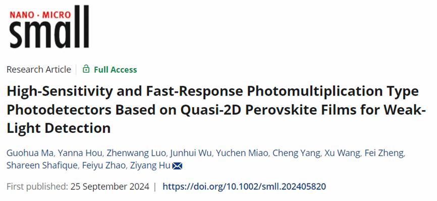 胡子阳教授领衔的课题组在准二维钙钛矿光电探测器领域取得了显著的科研成果。该团队的研究论文 “High-Sensitivity and Fast-Response Photomultiplication Type Photodetectors Based on Quasi-2D Perovskite Films for Weak-Light Detection” 在国际知名学术期刊《Small》上发表。论文的第一作者是麻豆av