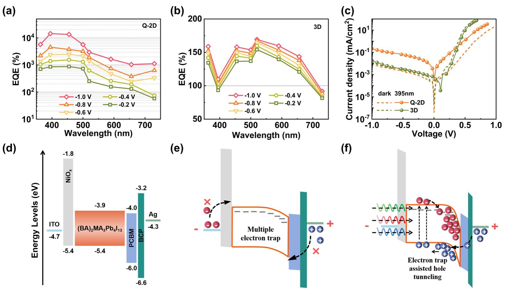图1. 基于准二维钙钛矿光电倍增型探测器的性能及物理机理示意图。