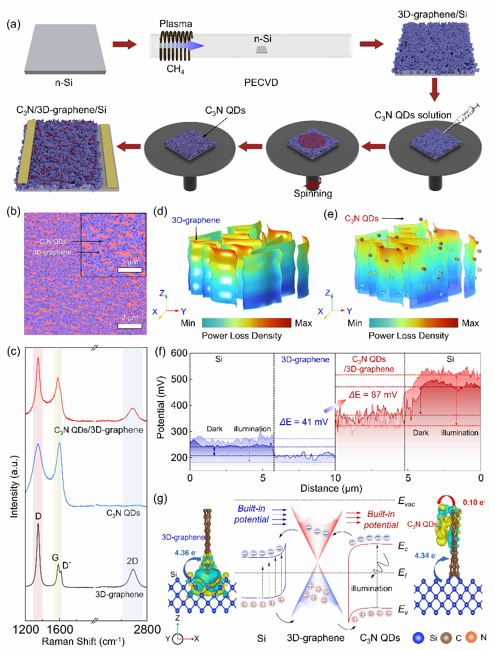 受此启发,研究人员设计了具有高对称性(D6h)的C3N QDs作为新型光敏材料,并与三维石墨烯/硅异质结构耦合构建光电探测器。三维石墨烯的多孔网络结构不仅显著增强了光吸收与电场局域效应,还为C3N QDs的有序分布提供了稳定支撑,从而形成多重内建电场,实现高效载流子分离与长寿命保持。