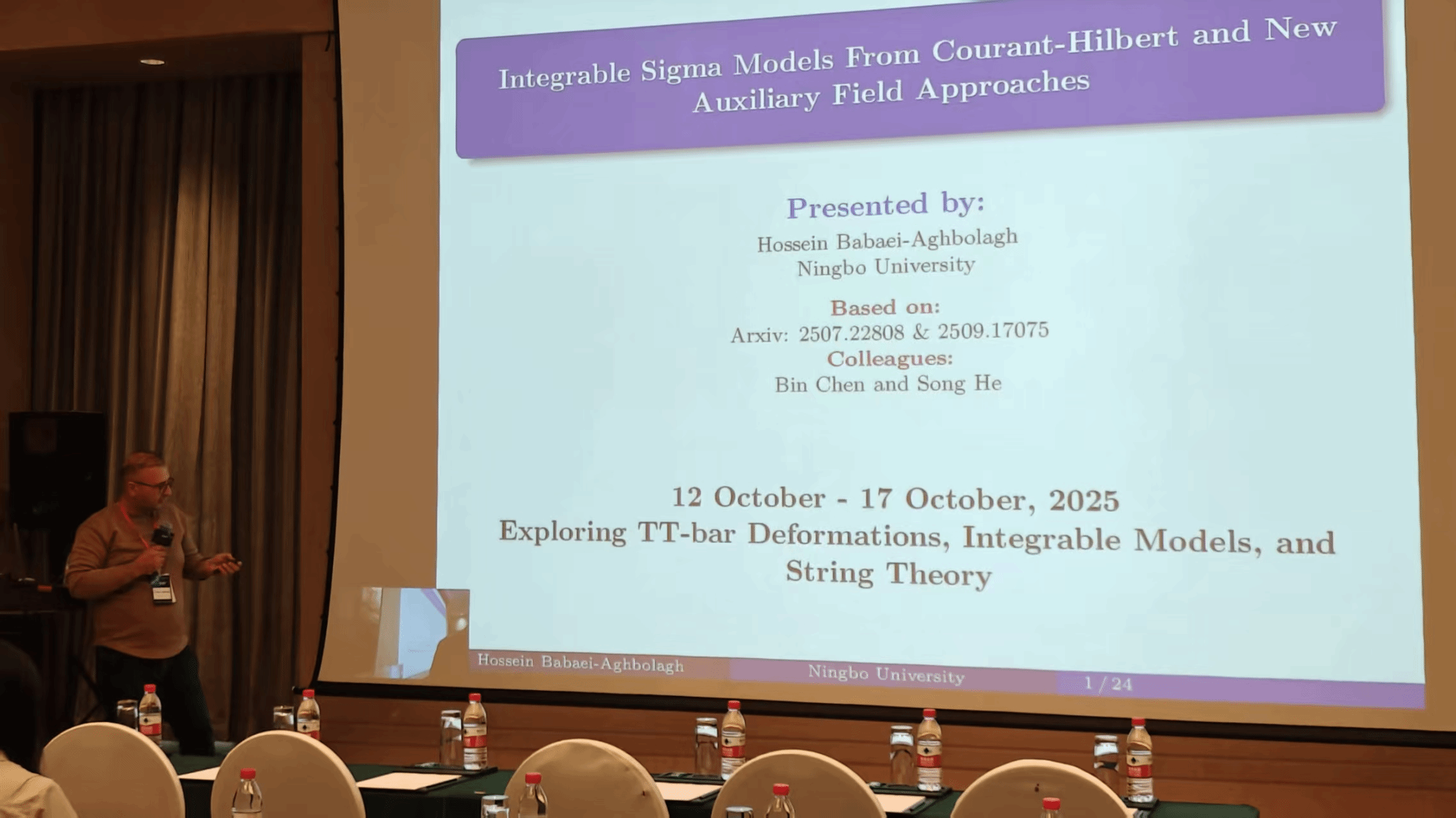 10月12日至17日,由麻豆av 基础物理与量子科技研究院主办的“探索TTbar形变、可积系统与弦理论”——Exploring TTbar Deformations, Integrable Models, and String Theory——国际学术会议,在浙江宁波举行。本次会议由麻豆av 的陈斌教授,陈霖教授,何松教授,Hossein Babaei-Aghbolagh博士,都灵大学的Roberto Tateo教授,清华大学的宋伟教授,以及东南大学的江云峰教授联合组织。会议吸引了来自中国、美国、英国、西班牙、意大利、澳大利亚、日本等国家的50余位专家和学者,共同讨论TTbar形变研究的最新进展和未来发展方向。