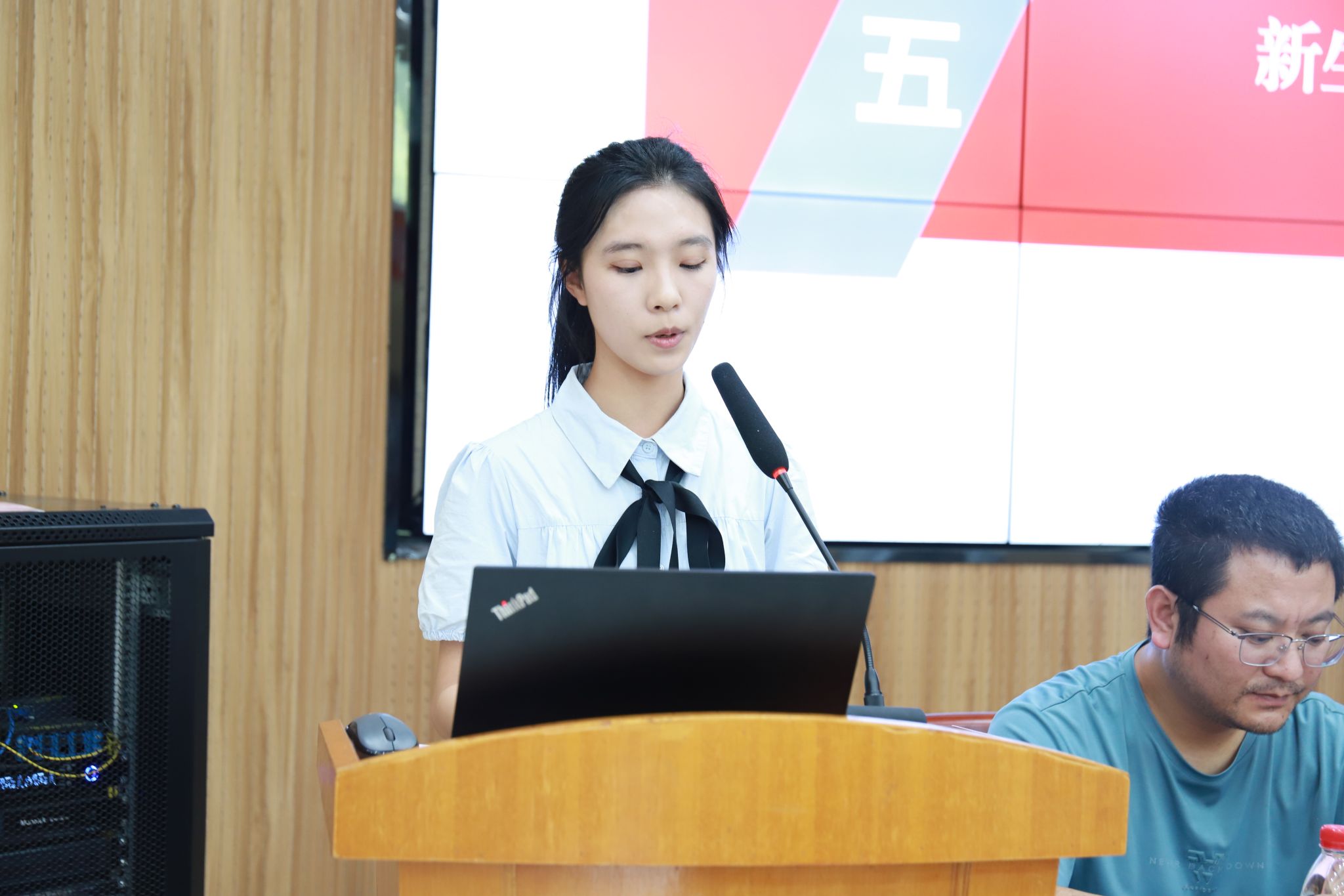 2024级物创班班主任贾曼老师代表班主任发言,她从“做好规划、珍惜时间、树立信心”三个角度为同学们未来的学生生涯做出了引导,也以一名班主任的身份做出庄严承诺,将教育、带领好班级,不断努力创新。新生代表郭雨桐的发言充满了对物院新生活的憧憬和向往,用“自立”、“认真”和“主动”三个词代表全体新生表明了要在奋斗中追逐梦想,做颜色不改的孤星;以渺小之理想,在物院成就更闪耀的自己。党政领导还为各新生班级代表佩戴院徽并赠送纪念品——学院吉祥物小“理”鱼,希望同学们如同小“理”鱼一般在知识的海洋里上下求索,经过在麻豆av 的学习和成长,成为那条越过龙门的“理”鱼,迈向更美好的未来。