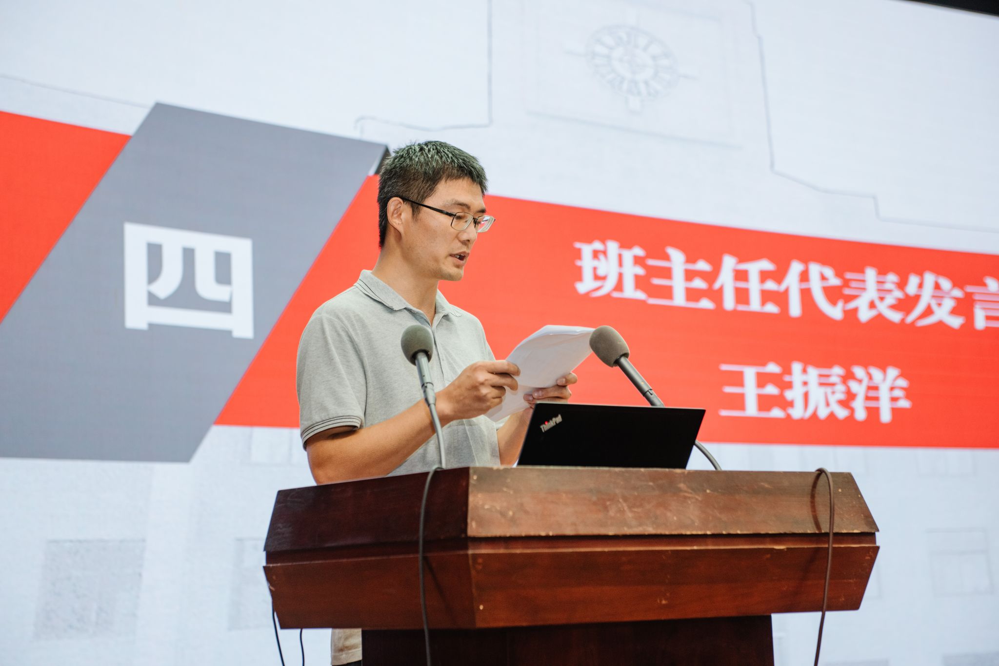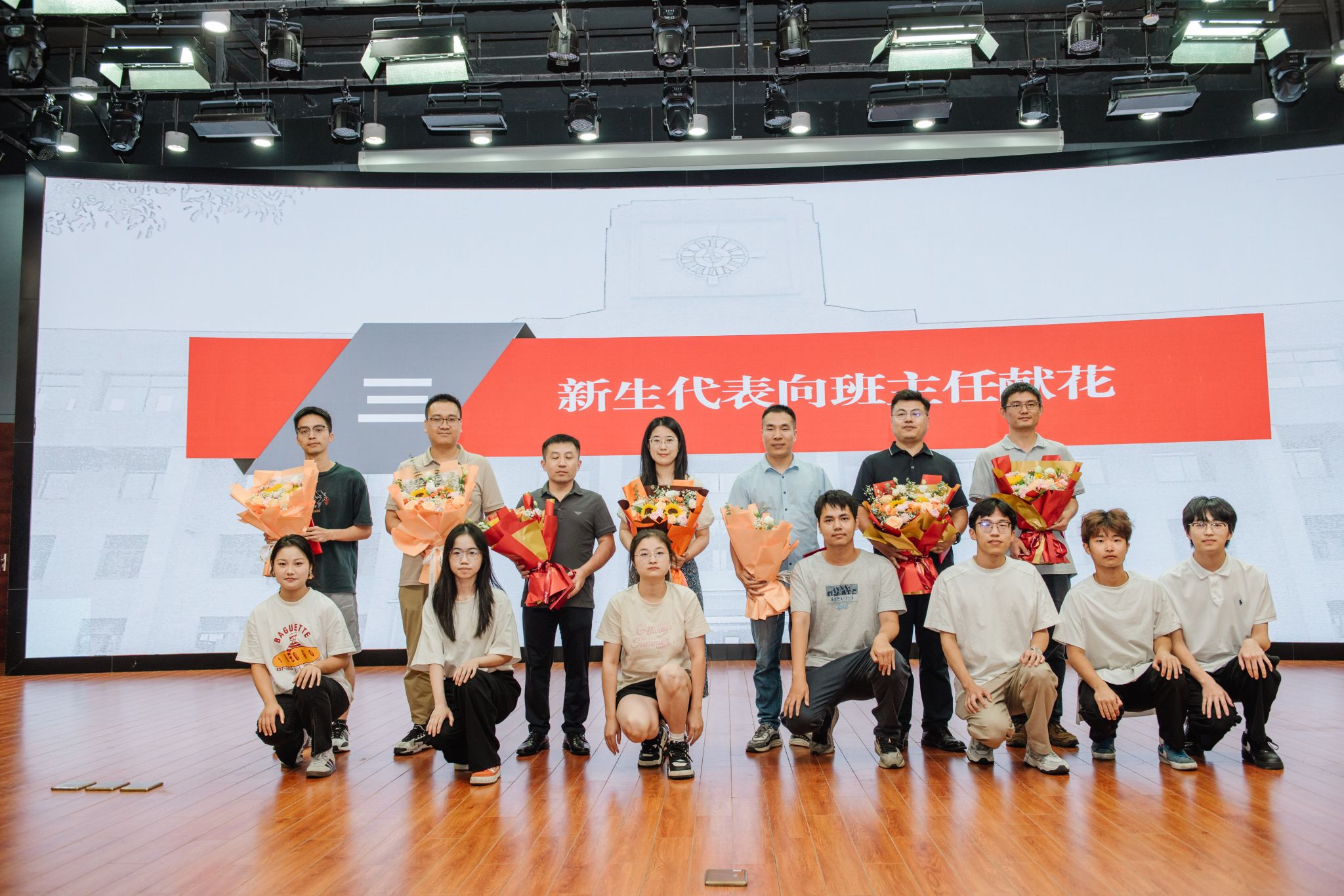 鲜花敬师,温情相牵。各班级新生代表手捧鲜花走上舞台,向班主任老师献花致意。一束束鲜花不仅表达了学子们对老师的崇高敬意,也缔结下来自五湖四海的师生情谊,温暖了整个会场。接着,2025级物创班班主任王振洋老师代表班主任发言,他结合自身教学科研经历,勉励同学们尽快适应大学节奏,“找准自己的路、学真本事、树立长远眼光”,主动响应学科与时代发展的需求,成为有格局、有韧劲、有温度的物理人。