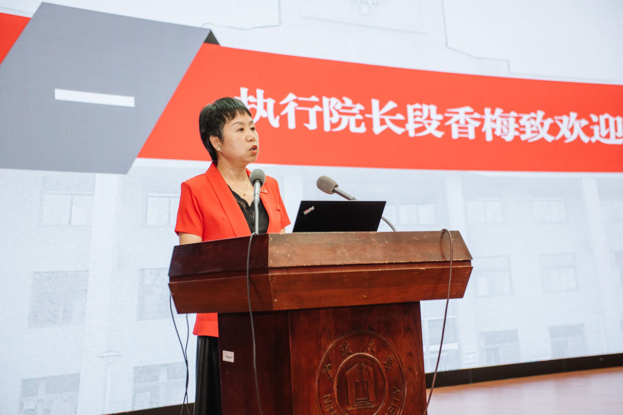 大会在庄严的国歌声中正式开始,学院执行院长段香梅致辞,她首先代表学院全体师生热烈欢迎2025级新同学的加入。她回顾了宁大物理学科自1960年办学以来,不断发展成为学科体系完善、高层次人才集聚、科研创新能力突出的研究型学院的历程。段院长强调,学院学科优势显著、师资力量雄厚,106位专任教师中75%以上具有海外学术背景,更不乏中国科学院院士、国家“杰青”等领军人才。她鼓励新生以“物理”为舟、以“奋斗”为桨,并提出三点希望:一要“以德领航,向光而立”,胸怀家国,传承科学家精神;二要“深扎根基,踏实奋进”,从每一堂课、每一次实验做起,培养严谨的科学思维;三要“知行合一,与国同行”,积极融入实验室、关注科技前沿,以创新实践回应时代命题。她寄语全体新生:“愿你们在这里真正‘寻光’而行、踏实‘生根’、勇敢‘发光’!”