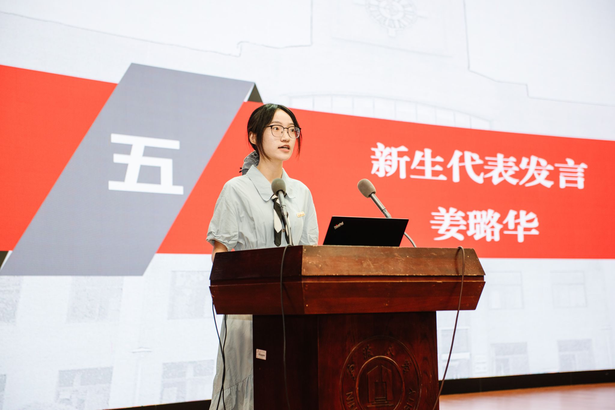 新生发声,共鸣强烈。研究生新生代表姜璐华同学分享了她从本科毕业赴贵州支教一年后重返学院的心路历程。她以“求知者、躬行者、追梦人”自勉,并号召全体新生践行“求实致远”院训,扎根专业、勇于担当,将个人成长融入国家发展。