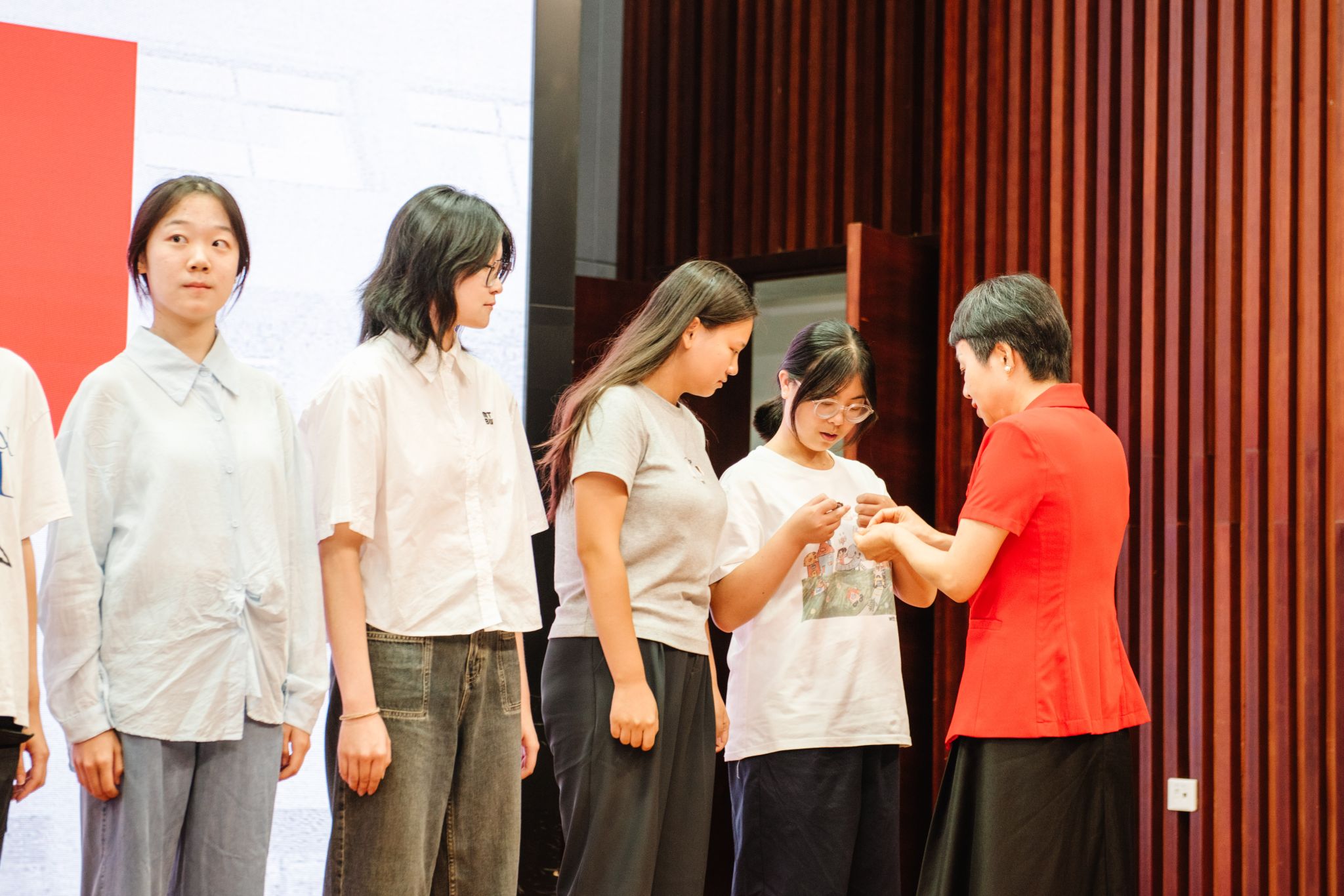 院徽佩戴,使命启程。学院党政领导为新生代表佩戴物理学院院徽,院徽不仅是身份的象征,更是一份精神的传递。它提醒每位同学铭记探索真理的初心,肩负起物理人的使命与荣光。