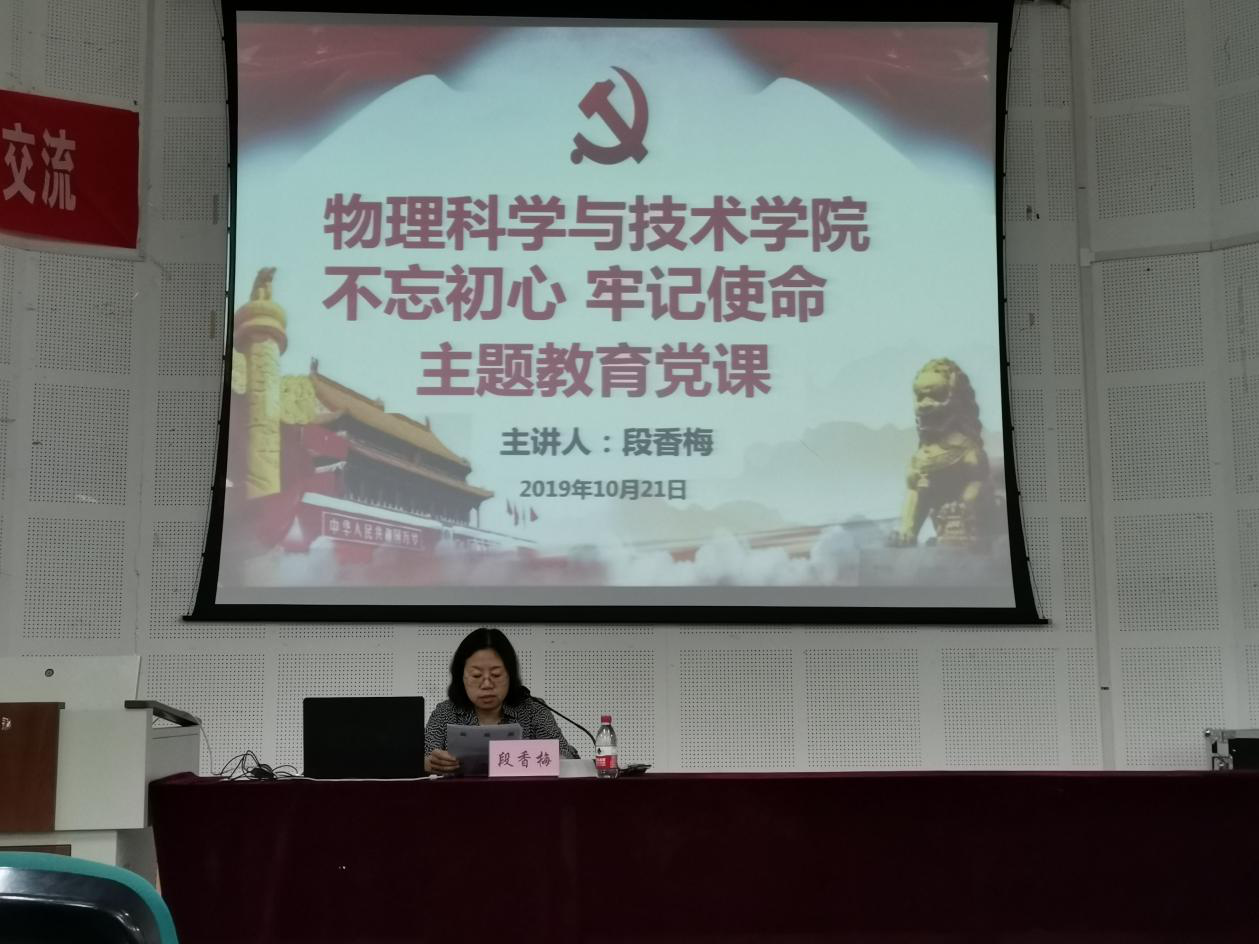 段香梅副院长在学院龙赛报告厅开展了主题为“不忘初心坚定信念,牢记使命勇于担当”的专题党课报告。全体研究生党员及预备党员参加了本次学习活动。 段院长通过讲解中国物理学的发展历史和于禄研究员的事例,鼓励研究生党员们不忘初心坚定信念,教育同学们如何做好科研工作,承担责任和义务,做一名合格的物理人,为中国物理科学的发展贡献自身的力量。报告中,段院长以近期国家奖学金评定为例...